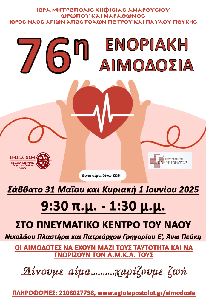 Με την πατρική ευχή και ευλογία του Σεβασμιωτάτου Ποιμενάρχου μας, Μητροπολίτου Κηφισίας Αμαρουσίου Ωρωπού και Μαραθώνος κ. Κυρίλλου, πραγματοποιήθηκε το διήμερο 15 και 16 Νοεμβρίου 2025, στο Πνευματικό Κέντρο του Ιερού Ναού Αγίων Αποστόλων Πέτρου και Παύλου Πεύκης, η 77η Εθελοντική Ενοριακή Αιμοδοσ...